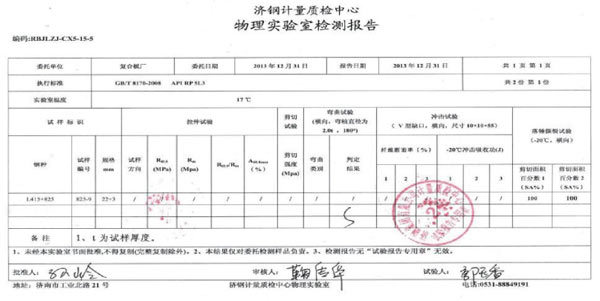 Pipeline steel clad plates are widely used in oil-gas transportation. Besides the high compressive strength, the low-temperature toughness and welding performance is very excellent. The 316L+X60 produced in 2013 was successfully applied in the oil-gas pipeline transportation project of Tarim Oilfield, which was the first oil-gas transportation pipeline made of stainless steel clad plate in China. See the test report from the Physics Lab of Jigang Measuring & Quality Inspection Center.